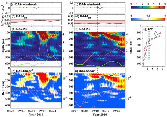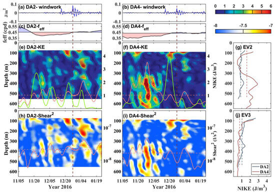 Wind−work at (a) DA2 and (b) DA4. Effective inertial frequency (feff) of (c) DA2 and (d) DA4, with red (blue) shading indicating the area controlled by negative (positive) vorticity. Observation of near-inertial KE () at (e) DA2 and (f) DA4. Near−inertial shear square at (h) DA2 and (i) DA4. (g) Time−mean near−inertial KE during event 1 of (e) DA2 and (f) DA4 plotted as a function of depth. The purple dashed line in this figure represents the average value of the solid during the time period, and the red vertical line indicates the time when the TC is closest to the moorings.