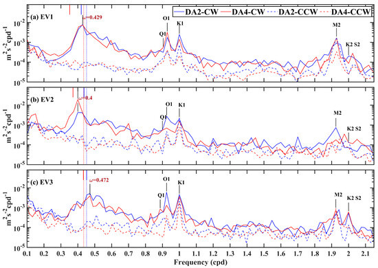 During event 2, the clockwise spectra (Figure 11b) at DA4 are dominated by near-inertial frequencies, with the near-inertial peak nearly an order of magnitude higher than the spectral values at the O1 and K1 frequencies. In contrast, the near-inertial KE at DA2 is weaker than the diurnal KE. The significant near-inertial peak is dominated by the clockwise component which has clear redshifts (0.886 f for DA2 and 0.92 f for DA4), while the counterclockwise spectra in the near-inertial band remain weak. Additionally, during event 3, DA2 also exhibits a peak in the clockwise spectrum at 0.5 cpd.