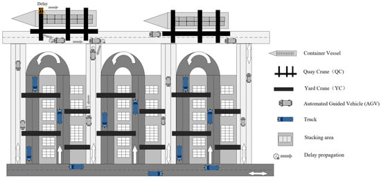 Ports are a critical component of the logistics chain [1], and their safety and stability significantly affect maritime transport efficiency and the overall stability of supply chains. In recent years, unforeseen events and political conflicts have frequently triggered port congestion, escalating shipping costs and posing significant challenges to terminal operations. For instance, the Red Sea crisis [2] and attacks by Houthi forces compelled many shipping companies to divert their routes around the Cape of Good Hope, which resulted in the loss of opportunities for refueling and unloading at Middle Eastern ports. This diversion has led to severe congestion at the Port of Singapore within the Central European shipping route. Such congestion has resulted in the accumulation of vessels, pushing the utilization rate of terminal yard spaces to nearly 90% [3], which has sharply increased the workload of loading, storage, and transfer handlings in the short term. This not only intensifies the operational pressure on equipment and complicates scheduling but it also heightens the likelihood of operational delays due to conflicting time windows, further exacerbating the congestion problem. As a vital component of the port, automated container terminals encompass various handling processes [4], including loading and unloading handlings by Quay Cranes (QC), transfer handlings performed by Automated Guided Vehicles (AGV), activities of Yard Cranes (YC) operating within the yard, and the retrieval and delivery of containers on the land side. These processes form an intricately interconnected and mutually influential system. When any segment experiences delay due to malfunctions or scheduling conflicts, the resulting delays tend to propagate throughout the terminal and impact the operational processes.