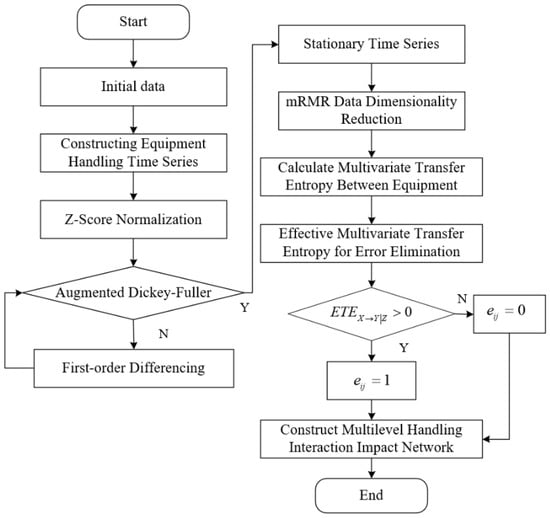 The specific methodology for constructing the multilevel handling interaction impact (MHII) network proposed in this paper is illustrated in Figure 2. First, the raw equipment handling time series undergoes data preprocessing, where Z-score normalization is applied for detrending and mean adjustment. Subsequently, the data are subjected to the ADF test. If the test is passed, dimensionality reduction is performed on the time series, followed by the calculation of effective multivariate transfer entropy among the time series. If the result of the multivariate transfer entropy calculation is , it indicates a causal relationship between the two variables. Finally, a multilevel handling interaction impact network is constructed with equipment as nodes and the relationships between them as edges.