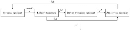 The propagation of delays among multilevel handling equipment occurs as a point-to-area diffusion process, akin to the spread of diseases within a network. The SEIR model has been extensively applied across various fields, including network information dissemination [41] and risk communication [42]. Due to the time windows between equipment operations, a delayed equipment does not immediately impact the equipment it interacts with. This characteristic makes the SEIR model more suitable than the SIS and SIR models for this scenario. A comparative analysis of the SEIR model and the multilevel handling delay propagation process reveals the following: