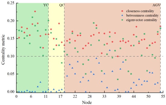 - The multilevel handling interaction network demonstrates inherent randomness. AGVs serve a critical mediating function within the entire interaction network. The interaction relationships between the AGV transfer link and the AGVs with the yard cranes exhibit significant strength, thereby greatly influencing the overall interaction network. It is essential to enhance the coordination mechanism between AGVs and the yard cranes to facilitate the efficient operation of container transfer and storage processes.