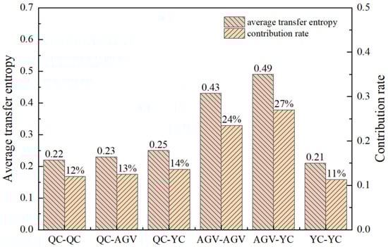 Here, and represent the discrete time series variables of the handling equipment, while and are the time lags of the time series, which determine the historical time series length of variables and . Variables and correspond to the historical information of variable at time . The transfer entropy indicates the information transfer from to , which can be understood as the reduction in uncertainty of after knowing the historical information of the quay crane variable , given the historical information of the AGV variable .
