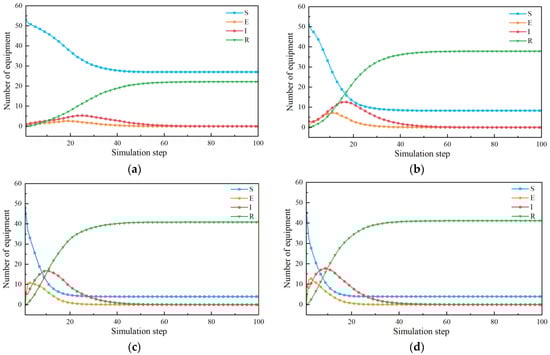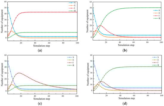 According to the parameter settings for equipment withdraw and dynamic control strategies in Section 5.3, target immunization is performed based on the critical nodes identified by . The equipment information is shown in Table 6. Starting with the AGV44 equipment, ranked first among the nodes, additional nodes are incrementally added in order of importance, until all eight core nodes are immunized. Propagation analysis is conducted for target immunization rates of 0.019, 0.037, 0.056, and 0.093, with the simulation results shown in Figure 11.