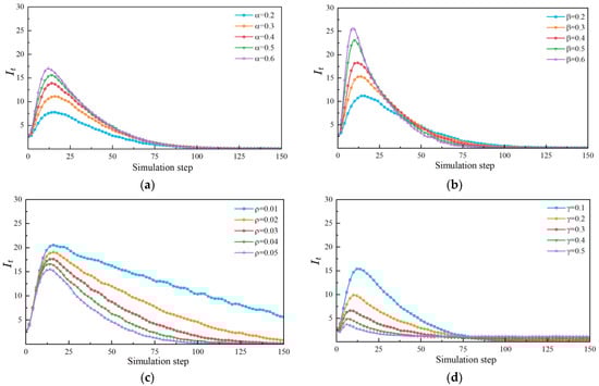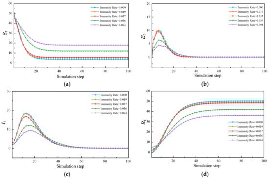 Delay propagation diagram of immunity control. (a) The variation trend of status under different immunity rates.; (b) the variation trend of status under different immunity rates.; (c) the variation trend of status under different immunity rates.; (d) the variation trend of status under different immunity rates.