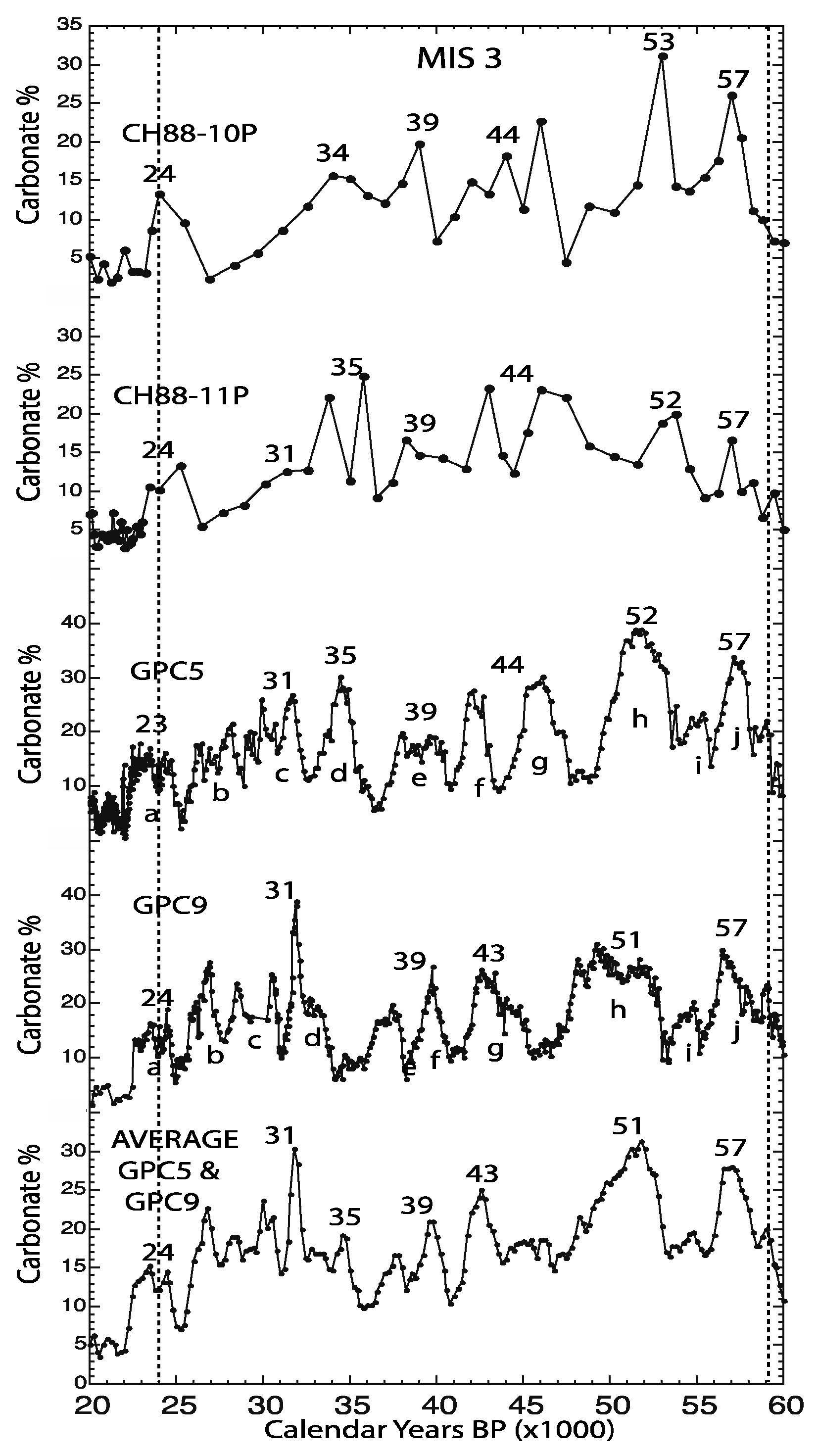 Carbonate variability in MIS 3 from the North Atlantic Ocean is shown in