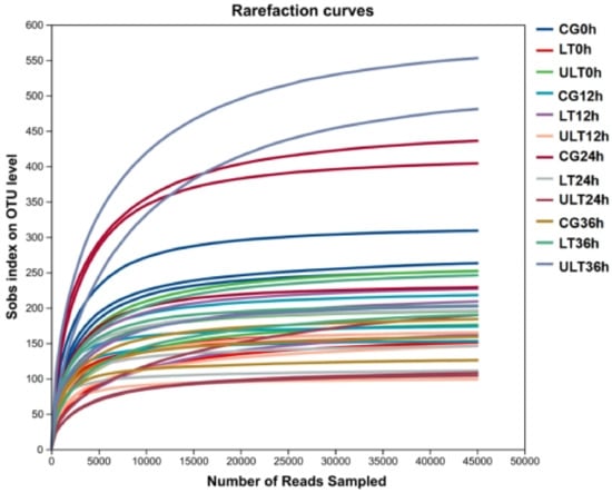 Rarefaction curves of gut content samples from the CG, HT group, and ULT group under different durations of cold stress.