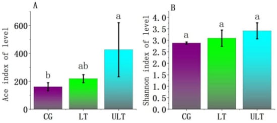 Analysis of α-diversity among different treatment groups ((A) Ace index diversity analysis; (B) Shannon index diversity analysis; different lowercase letters indicate significant differences between groups, p < 0.05).