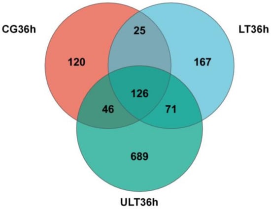 A Venn diagram was constructed to analyze the distribution of OTUs among the CG, HT group, and ULT group at 36 h (Figure 3). The total number of OTUs for the CG, HT group, and ULT group were 317, 389, and 932, respectively, consistent with the Ace and Shannon index results. After 36 h, there were 25 common OTUs between the CG and LT group, 46 common OTUs between the CG and ULT group, and 71 common OTUs between the LT and ULT groups. Specifically, there were 120 unique OTUs in the CG, 167 in the LT group, and 689 in the ULT group, with 126 OTUs shared among all three groups.