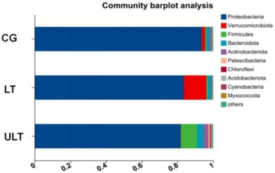 After 36 h of cold stress, the gut microbiota compositions of the different experimental groups varied at the phylum level. As shown in Figure 4, Proteobacteria was the most predominant phylum in the CG, LT group, and ULT group after 36 h of cold stress. With decreasing temperature, the proportion of Proteobacteria decreased, accounting for 93.6%, 83.7%, and 81.7% of the total bacterial count in the CG, HT group, and ULT group, respectively. Proteobacteria, Verrucomicrobiota, and Bacteroidota were dominant phyla in both the CG and ULT group. In the CG, Verrucomicrobiota and Bacteroidota represented 1.98% and 1.84% of the total bacterial count, respectively, and 12.53% and 1.61% in the LT group. However, there was a shift in the dominant phyla in the ULT group, where Proteobacteria, Firmicutes, and Bacteroidota were prevalent. In the ULT group, Firmicutes and Bacteroidota accounted for 9.05% and 3.73% of the total bacterial count, respectively.