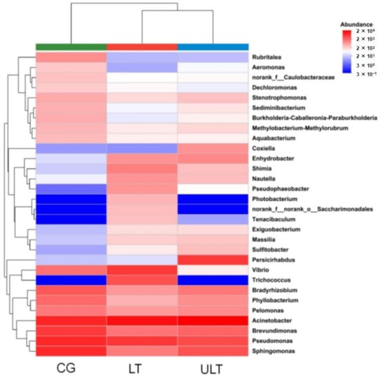 Cluster analysis of the gut microbiota at the genus level was conducted for the three treatment groups (Figure 5), including the 30 most abundant microbial genera in each group. The analysis revealed that the dominant genera in the CG were primarily Acinetobacter, Brevundimonas, Pseudomonas, and Sphingomonas. In the LT group and ULT group, the dominant genera differed from those in the CG. In the LT group, the predominant genera were Acinetobacter, Pseudomonas, and Trichococcus. In the ULT group, the dominant genera were Acinetobacter, Persicirhabdus, Pseudomonas, and Sphingomonas.