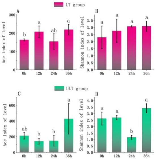 Analysis of α-diversity was conducted for two different low-temperature groups at various time intervals (Figure 6). After 36 h of cold stress, the LT group showed a significantly lower Ace index at 0 h compared to 12 h and 36 h (p < 0.05) (Figure 6A). The Shannon index in the LT group did not show significant differences across the stress periods (p > 0.05) (Figure 6B). For the ULT group, as depicted in Figure 7, the Ace index was significantly higher at 36 h compared to 12 h and 24 h (p < 0.05), but there was no significant difference compared to 0 h (p > 0.05). The Shannon index in the ULT group was significantly lower at 24 h compared to other time intervals (p < 0.05) (Figure 6D).