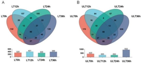 Venn diagrams analyzing the distribution of OTUs over time under different low-temperature conditions are shown in Figure 7. In the LT group, the numbers of OTUs at 0, 12, 24, and 36 h were 320, 401, 305, and 389, respectively, with unique OTUs at these time points numbering 132, 157, 105, and 139, and 86 OTUs common across all four time points (Figure 7A). In the ULT group, the numbers of OTUs at 0, 12, 24, and 36 h were 420, 265, 262, and 932, respectively, with unique OTUs at these intervals numbering 179, 84, 67, and 656. The ULT group had 88 OTUs common across all four different time intervals (Figure 7B).