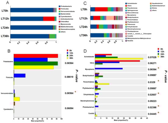 In the LT group’s phylum-level microbial community analysis, Proteobacteria was the dominant phylum across all time points, with an increase in the proportion of Firmicutes at 12 h, accounting for 24.5% of the total microbial population at that time before returning to baseline levels at 24 and 36 h. Verrucomicrobiota increased to 12.5% of the total microbial population at 36 h (Figure 8A). As shown in Figure 8B, significant differences were observed only in Verrucomicrobiota across different time intervals (p < 0.05). At the genus level, Vibrio showed a declining trend over time under cold stress, whereas Mycoplasma significantly increased at 12 h (p < 0.05), becoming the dominant genus at this time point before returning to initial levels at 24 and 36 h. Acinetobacter showed a rising trend at 24 and 36 h, becoming the dominant genus at these time points (Figure 8C). According to Figure 8D, significant differences were observed in Mycoplasma, Persicirhabdus, Enhydrobacter, Photobacterium, and Coxiella across different time intervals (p < 0.05).