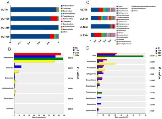 In the ULT group’s phylum-level microbial community analysis, Proteobacteria remained the dominant phylum across all time points. Notably, there was an increase in the proportion of Firmicutes at 12 and 36 h, accounting for 14.4% and 9.1% of the total bacterial count, respectively. Additionally, the proportions of Bacteroidota and Actinobacteriota also increased at 36 h (Figure 9A). As shown in Figure 9B, significant differences were observed in Actinobacteriota, Spirochaetota, and Chloroflexi across different time intervals (p < 0.05). At the genus level, Vibrio was the dominant genus at 0, 12, and 24 h, reaching its highest proportion at 24 h, comprising 76.4% of the total bacterial count. However, by 36 h, Acinetobacter emerged as the dominant genus, significantly increasing at this time point (p < 0.05) and accounting for 30% of the total bacterial count. Additionally, Pseudomonas showed a declining trend at 0, 12, and 24 h, returning to its original level by 36 h (Figure 9C). According to Figure 9D, significant differences in the relative abundances of Acinetobacter, Sphingomonas, Brevundimonas, Bradyrhizobium, Photobacterium, Enterococcus, and Phyllobacterium were observed across different time intervals within the ULT group (p < 0.05).