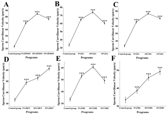 3.2. Impact of Cryoprotectants on Curvilinear Velocity of M. nobilis Sperm