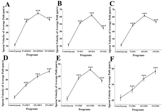 3.3. Impact of Cryoprotectants on Average Path Velocity of M. nobilis Sperm