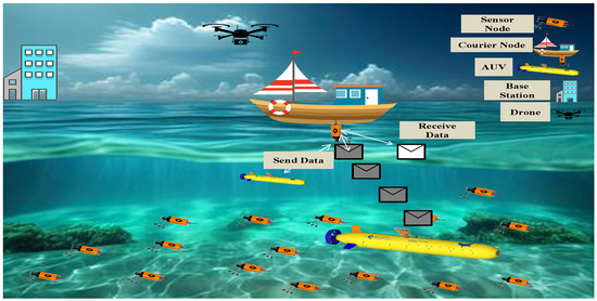 UWSNs have emerged as a groundbreaking technology, revolutionizing communication and data collection in the underwater domain. These networks, composed of spatially distributed sensors that utilize acoustic signals, enable the monitoring and transmission of critical information, overcoming the unique physical challenges posed by the underwater environment. UWSNs have expanded the scope of applications, including oceanographic mapping, marine biodiversity monitoring, underwater earthquake detection, maritime navigation, and disaster prediction []. They also play a pivotal role in tactical surveillance and resource management, providing real-time data to improve our understanding of underwater ecosystems and address pressing global challenges. However, the underwater environment presents significant challenges including high bit error rates (BER), often caused by environmental interference, and the inherent vulnerability of acoustic channels increases the likelihood of communication failures. Additional complications include fluctuating channel conditions, limited bandwidth (B), and limited channel capacity (C), all of which can degrade network performance. These harsh conditions underscore the necessity of robust MAC protocols. Effective MAC protocols are critical for managing channel access, mitigating interference, and ensuring reliable communication under challenging conditions [].