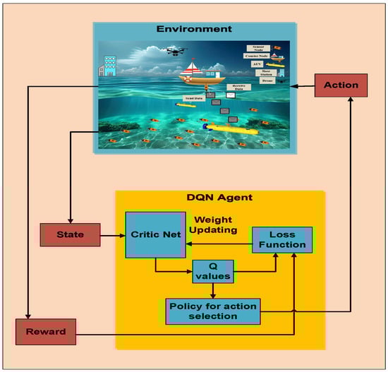 where is the learning rate, is the discount factor, is the immediate reward, and represent the current state and action, respectively. The reward function is carefully designed to incentivize energy-efficient operation, reduced collisions, and timely delivery of critical data. Through repeated interactions, the DQN optimizes the protocol’s performance by balancing energy consumption, channel utilization, and packet delivery priorities. In summary, by incorporating RL through DQN, the DAWPC-MAC protocol dynamically adapts to changing network conditions, learns to resolve collisions effectively, and enhances the overall efficiency and scalability of the underwater communication system.