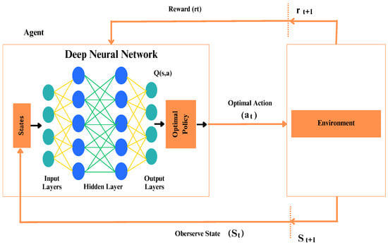 At each state, agents use a decision policy based on the learned Q-values to choose an action. The agent picks an optimal action and moves to a new state based on the Q-values cached in the Q-table. The decision policy is critical for determining how the agent acts and performs, enables it to dynamically adapt to its environment, and permits the agent to learn efficiently under the guidance of the decision network’s objectives. The loss function is the difference between current Q-value and expected (target) Q-value given by Bellman equation, which we want to minimize. This loss function guides the training of Q-values for the agent’s timely evolution and learning of better decisions over time. Loss function (defined by Equation (19)):