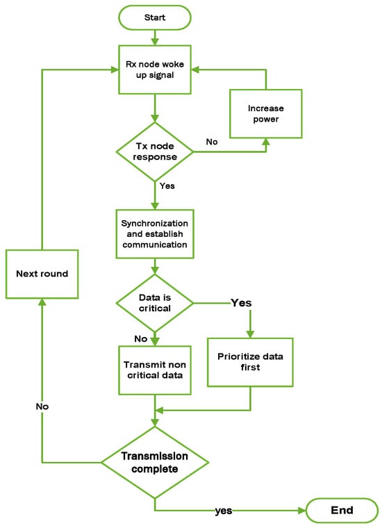 The wake-up signal power is dynamically adjusted based on the communication conditions, which can be either initial low power, increased power for extended coverage, or sleep mode. The wake-up signal duration and the waiting time for a response are defined. The timer is reset each time the power state changes, ensuring that a fresh waiting period is started whenever the wake-up signal power is adjusted. The timer ends if no response is received within the timeout period. If a response is received during this time, communication continues; otherwise, the receiver transitions to sleep mode, and the power is reduced to zero to optimize energy consumption. Each time the power state is adjusted, the timer is restarted, and communication continues as long as a response is received within the allocated time. Critical data packets (e.g., emergency data, object-tracking information) are prioritized over routine data (e.g., environmental monitoring) based on urgency and network conditions. Prioritization is based on packet type in Equation (9):