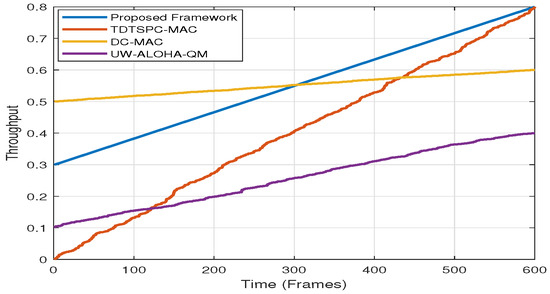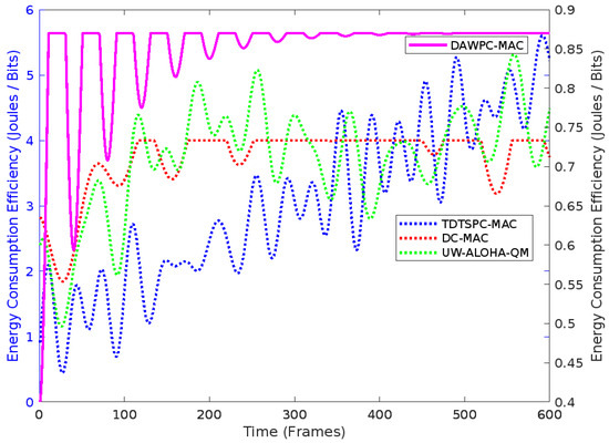 Figure 9 shows how the collision rate in a network changes as the traffic load increases. When the traffic load is low (0–100 frames), the collision rate is quite high, meaning nodes are frequently clashing while trying to access the communication medium. As traffic load increases (100–400 frames), the collision rate decreases significantly, suggesting that the system improves access management and avoiding collisions. After approximately 400 frames, the collision rate stabilizes at a low and steady value (around 0.05–0.1), indicating that the system can manage heavy traffic smoothly. This all shows how DAWPC-MAC or scheduling method is built to be adaptive and collision-free, ensuring the network can keep running fine, even at heavy load.