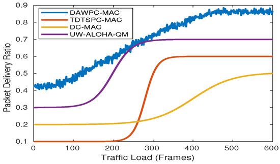 Figure 10 shows how well the network delivers packets as the traffic load increases. When traffic load is low (0–100 frames), the packet delivery ratio (PDR) starts low, around 40%, likely due to inefficiencies or competition for network access. As the load increases (100–400 frames), the PDR steadily improves, reaching about 80%, meaning that the network becomes much better at delivering packets. After 400 frames, the PDR levels around 85–90%, which shows that the system is working at its best and handling heavy traffic efficiently. This pattern highlights how the DAWPC-MAC protocol or system adapts to growing traffic and ensures reliable data delivery even under higher loads.