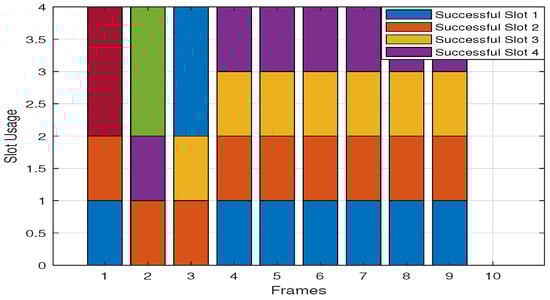 Figure 11 bar chart shows how four slots (Slot 1 to Slot 4) are successfully used over 10 frames in the network. Each bar represents a frame, and the different colors show how much each slot contributed to successful communication. Some frames show a balanced use of all slots, while others have uneven usage, likely because of competition or how the proposed DAWPC-MAC system schedules access. This pattern gives a clear picture of how well the network manages its resources and whether the slots are shared fairly and efficiently among users.