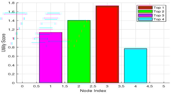 Each factor, representing an important aspect of network performance or node behavior, is assigned a weight that determines its relative importance in the final utility value. Specifically, is associated with the quality of the node’s signal, with higher signal quality (represented by Q) being preferred. and are related to the distance and transmission rate, respectively, with smaller distances (represented by ) and higher transmission rates (represented by ) being favored. focuses on energy efficiency, with nodes having higher remaining energy being prioritized. reflects stability, with more stable nodes being favored for their consistent behavior. Finally, accounts for signal attenuation, with less attenuation (represented by ) being preferred for effective communication. By assigning different weights to these factors, the utility function allows the prioritization of nodes based on overall network goals, such as maximizing throughput, minimizing energy consumption, and reducing collisions, leading to more efficient and reliable slot allocation in the network. Figure 13 bar chart, “Utility Scores for Candidate Nodes (First Simulation)”, is used to compare the utility of different nodes in a simulated scenario. The nodes are numbered from 1 to 5, and their utility scores are displayed on the y-axis. Node 2 is identified as the best choice, with the highest score of around 3.5. Node 5 and Node 1 are ranked next with decent scores, while Nodes 3 and 4 have lower scores. The colors of the bars are used to highlight the rankings, allowing for easy identification of the nodes that performed better in this simulation of proposed DAWPC-MAC.