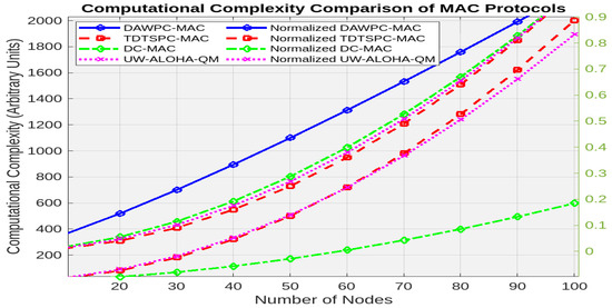 Finally, this analysis compares the computational complexity of the proposed DAWPC-MAC protocol with three benchmark techniques: TDTSPC-MAC, DC-MAC, and UW-ALOHA-QM as depicted inf Figure 15. The results are based on simulated complexity trends for networks with 10 to 100 nodes.