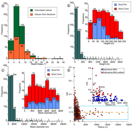 - Large to giant mud volcanoes (N = 202; area > 9 km2), related to massive upwellings of mud breccia, show a mean height of ∼ 325 m (range = 14–2364 m), a mean diameter of ∼6006 m (3990–42,000 m), a mean volume of ∼20 km3 (range = 0.06–1092 km3), and a mean slope of ∼6.1° (range = 0.4–15.9°).