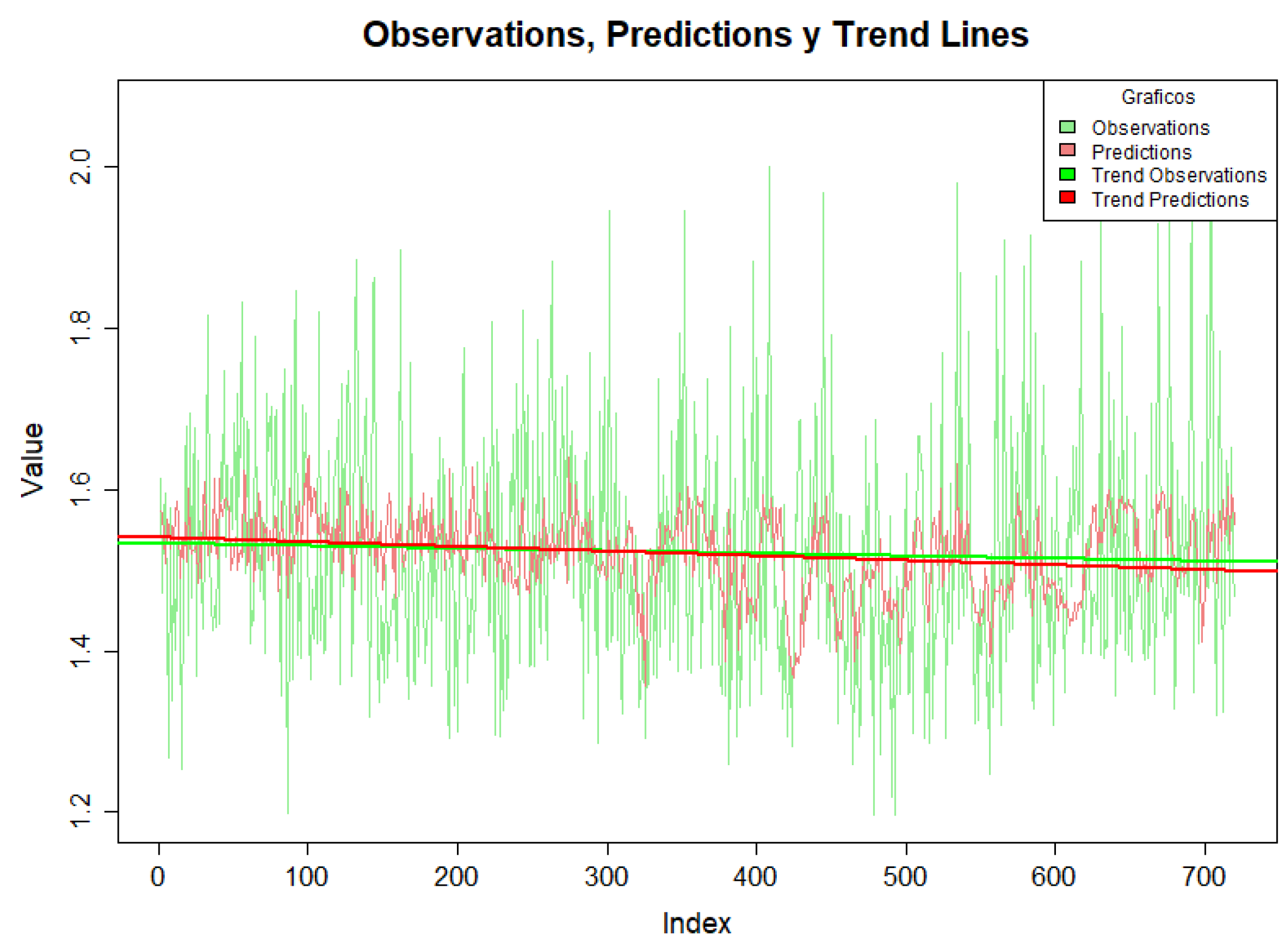 The performance in term of exhibits notably low values across all predictions. However, it is important to highlight that the trend line between the actual observations and the predictions demonstrates a high degree of congruence, as shown in Figure 5. In this figure, the x-axis represents the indices of the test set values, while the y-axis displays the predicted and actual values of . This finding suggests that, despite the imprecision of individual predictions, the models are capable of adequately capturing the overall trend of the data. This behavior indicates that with further adjustments, such as the inclusion of variables with higher correlation, the predictive capacity of the model could be significantly improved in future studies.