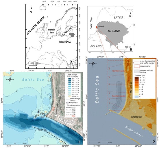 Location of the study area (A,B). Construction stages of the Klaipėda Port jetties, shoreline dynamics in the study area from 1835 to 2022, and nearshore morphological changes from 1910 to 2019 (C). Planned location of the artificial sandbar and locations of analysed cross-shore profiles (D) ((C) adapted with permission from [15]).