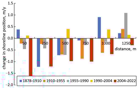 As intensive accumulation was occurring on the subaerial coast and the shallow nearshore region (0–2 m depth), the shoreline advanced seaward (Figure 1B), while in the deeper nearshore, bed erosion began (Figure 1C). After the completion of the northern jetty in 1878, the shoreline stopped moving seaward. Shortly after, nearshore erosion on the downdrift side of the port’s northern jetty began, inducing subaerial beach erosion, which persists to the present day (Figure 1B,C). Figure 2 illustrates the temporal variability of erosion rates on the downdrift side of Klaipėda Port. Notably, the period between 1990 and 2004, when shoreline retreat in the study area halted and, in some sections, even shifted seaward, is attributed to the influence of sunken ships.