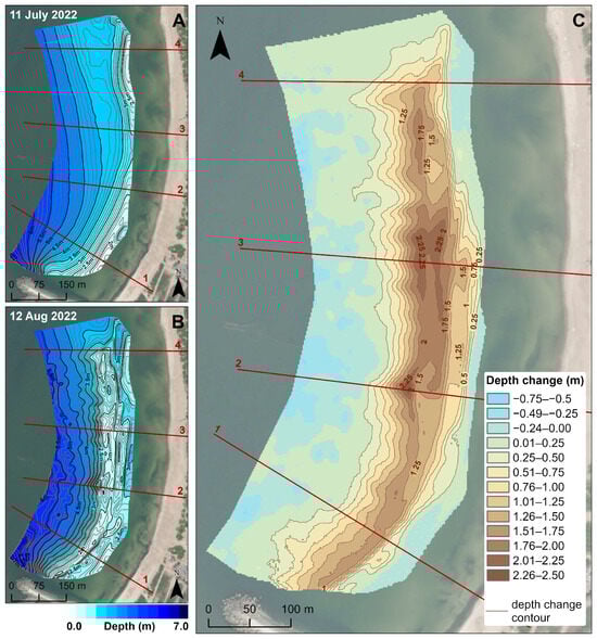 Nearshore bathymetry before nourishment on 11 July 2022 (A) and after nourishment on 12 August 2022 (B), with the morphology of the artificial sandbar (C).