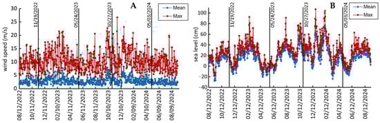 Mean and maximum wind speed (A) and sea level (B) from 12 August 2022 to 7 September 2024.