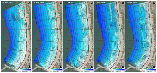 Nearshore bathymetry between 19 November 2022 and 7 September 2024: (A)—19 November 2022; (B)—24 May 2023; (C)—27 October 2023; (D)—3 May 2024; (E)—7 September 2024.
