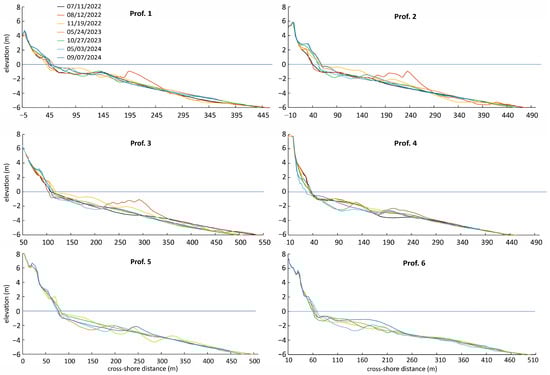 Cross-shore profiles illustrating subaerial and subaqueous coastal changes after nearshore nourishment. The locations of the cross-shore profiles are shown in Figure 5.