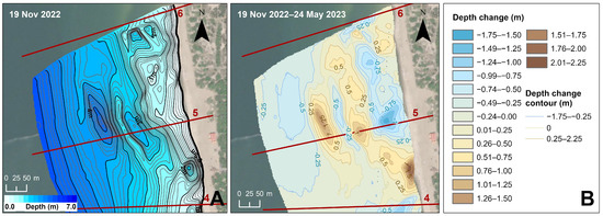 Nearshore bathymetry on 19 November 2022 (A) and its changes between 19 November 2022 and 24 May 2023 (B), illustrating the filling of previously existing pits caused by NW sediment transport during this period.