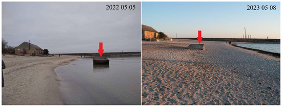 This hypothesis is supported by the documented sinking of a vessel in the vicinity of the study area. The cargo ship Rudolf Breitscheid, with a length of 142 m, sank in proximity to the distal end of the northern jetty in 1988. The parallel sinking of the ship extended the jetty in a northerly direction, thereby sheltering this coastal section from wind and waves [15]. The dismantling of the ships commenced in 1995, and by 2005, the removal of the last wreckage was completed. Consequently, shoreline retreat resumed and intensified following their removal [15]. The shoreline retreat was the most significant within the immediate 250 m from the jetty, with an estimated increase of up to 2.5 m/year (Figure 2).