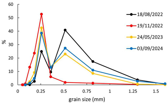 Sand grain size distribution in the middle of the beach between 18 August 2022 and 3 September 2024.