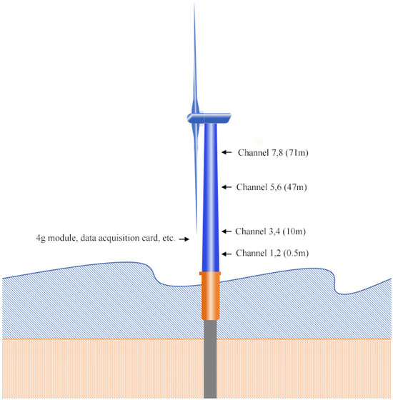 This study used data collected from a 5 MW, monopile-based, offshore wind turbine located in the East China Sea. The turbine has a height of 107.96 m, with a pile leg having an outer diameter ranging from 7 m to 8 m and a wall thickness of 0.075 m, and a tower frame with an outer diameter ranging from 4.02 m to 7 m and a wall thickness of 0.036 m to 0.045 m.