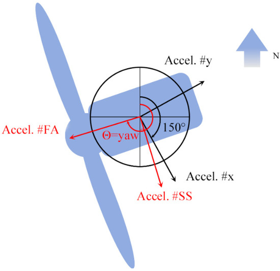 The nacelle of the offshore wind turbine adjusts its yaw angle following the wind direction for maximum wind energy utilization. As the coordinate system does not change with the yaw angle, the collected acceleration data need processing based on the nacelle’s yaw angle, converting x and y accelerations to fore–aft (FA) and side–side (SS) ones as per Equations (1) and (2):