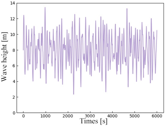 For instance, under Wave Condition 1 in this paper, we selected an average wave height of 6 m, a wavelength of 25 m, along with setting and . The sampling frequency was configured to be within the range of 0.1 Hz to 5.1 Hz, and the time domain was set to 600 s. With a step size of 0.1 s, the simulation was carried out six times. The time-domain diagram of wave height is shown in Figure 4.