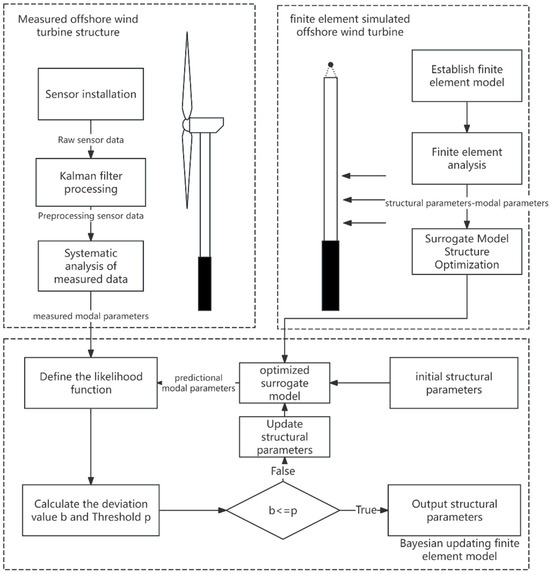 After obtaining the modal parameters of the structure through AOMA, a digital twin (DT) is developed. A DT is a virtual model that accurately replicates the physical information of the wind turbine. It can calculate the remaining lifespan of the structure, simulate the stress condition of the structure with preset external loads, and contribute to the exploration of the mechanical characteristics of the structure [15,16,17]. This model mainly stems from minimizing the difference between the virtual output and the measured output, where the output usually refers to the structural modal parameters obtained through AOMA. For wind turbines, the use of a DT that automatically updates the virtual model according to the measured modal parameters can effectively enhance the monitoring efficiency of changes in structural reliability. The model update methods can be divided into two categories: deterministic optimization [18] and Bayesian inference [19]. Both of these methods have their own advantages and disadvantages in engineering and have been widely adopted. In wind turbines, due to the severe external environment, the measured modal parameters inevitably contain errors caused by factors such as wind force and mechanical operation, which subsequently affect accuracy during the DT update.