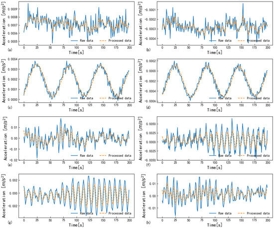 Utilizing Kalman filtering to perform preprocessing on the data obtained from eight sensors on the wind turbine, with the aim of reducing the components that display relatively low stability. (a) Sensor 1; (b) Sensor 2; (c) Sensor 3; (d) Sensor 4; (e) Sensor 5; (f) Sensor 6; (g) Sensor 7; (h) Sensor 8.