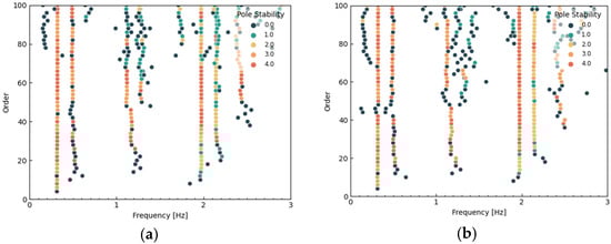 In the research content related to Figure 7, a rating was carried out for the stability of structural frequency points. The rating basis encompassed two aspects, namely hard indicators and soft indicators. Those frequency points that exhibited stability in the three aspects of frequency, damping ratio, and mode shape were assigned a marked value of 4.0. If a frequency point failed the test of damping ratio stability, it was correspondingly marked as 3.0. If it did not pass the assessment of mode shape stability, it was marked as 2.0. The frequency points that were only stable in the frequency dimension yet did not meet the stability requirements regarding damping ratio and mode shape were marked as 1.0. The frequency points that did not pass the stability tests in all three dimensions of frequency, damping ratio, and mode shape were marked as 0.0.