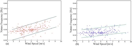 Correlation between the first-order natural frequencies of the offshore wind turbine with respect to the wind speed. (a) Fore–aft direction; (b) side–side direction.