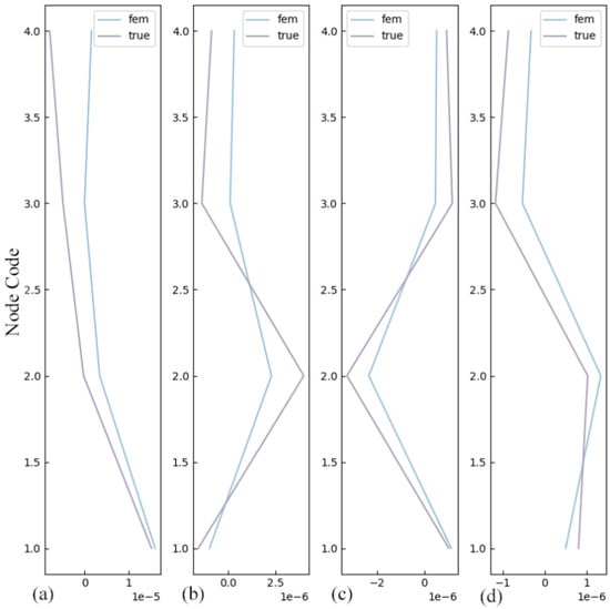 Comparison of modal shapes between the finite element model and the measured structure (1st–4th order): (a) corresponds to the 1st modal shape, (b) corresponds to the 2nd modal shape, (c) corresponds to the 3rd modal shape, and (d) corresponds to the 4th modal shape.