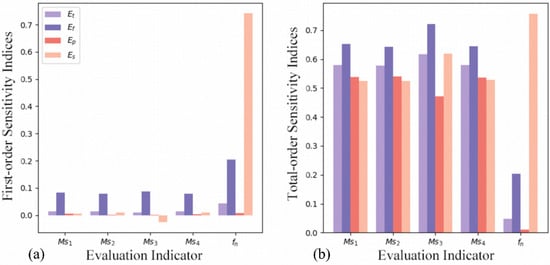 Diagram of sensitivity analysis of wind turbine structural parameters to modal parameters: (a) first-order sensitivity index; (b) total-order sensitivity index.